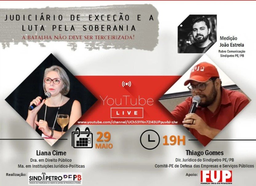 Na sexta-feira (29), o Sindipetro PE/PB irá transmitir a live “Judiciário de Exceção e a Luta pela Soberania”, que irá debater questões como a flexibilização das normas jurídicas, a politização do poder judiciário e a luta em defesa dos interesses nacionais contra a agenda privatista dos dois últimos governos.  Participarão do encontro a advogada e professora da Faculdade de Direito do Recife (UFPE), Dra. Liana Cirne Lins e o diretor de Assuntos Jurídicos do Sindicato dos Petroleiros de Pernambuco e Paraíba, Thiago Gomes. A transmissão começará às 19h e será realizada pelo nosso canal no Youtube.